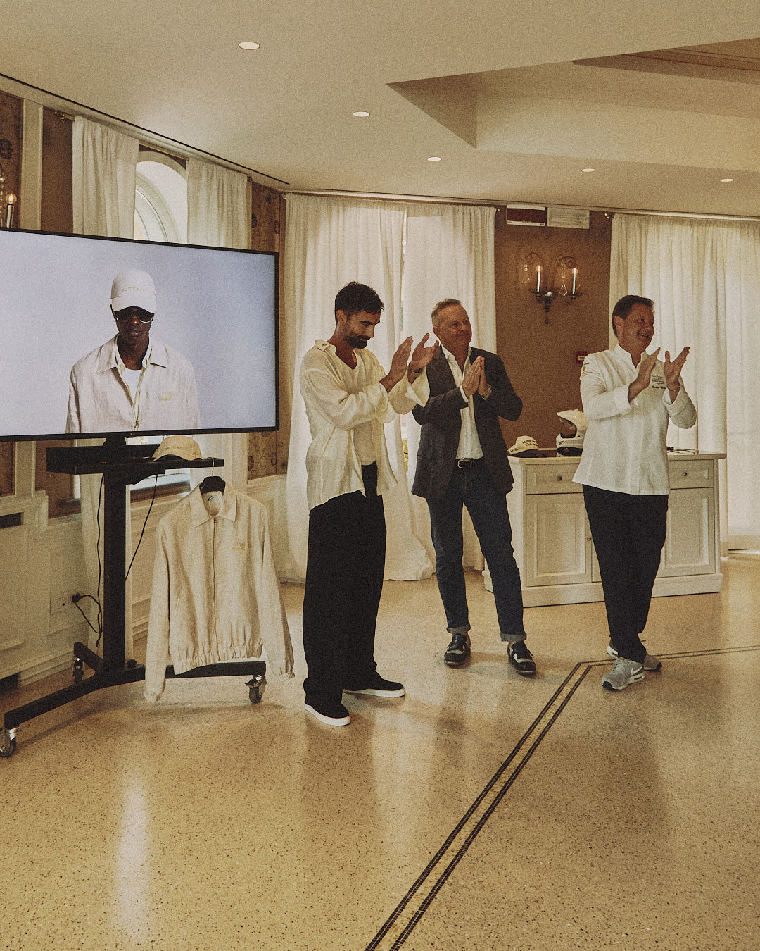 In honor of the event and emphasizing the family values of Fratelli Cerea, Da Vittorio's family owners, we have created an exclusive capsule collection featuring a cap and jacket made from 100% natural, hand-sewn linen with gold zipper details and an embroidered logo in gold inspired by Da Vittorio's iconic design.
